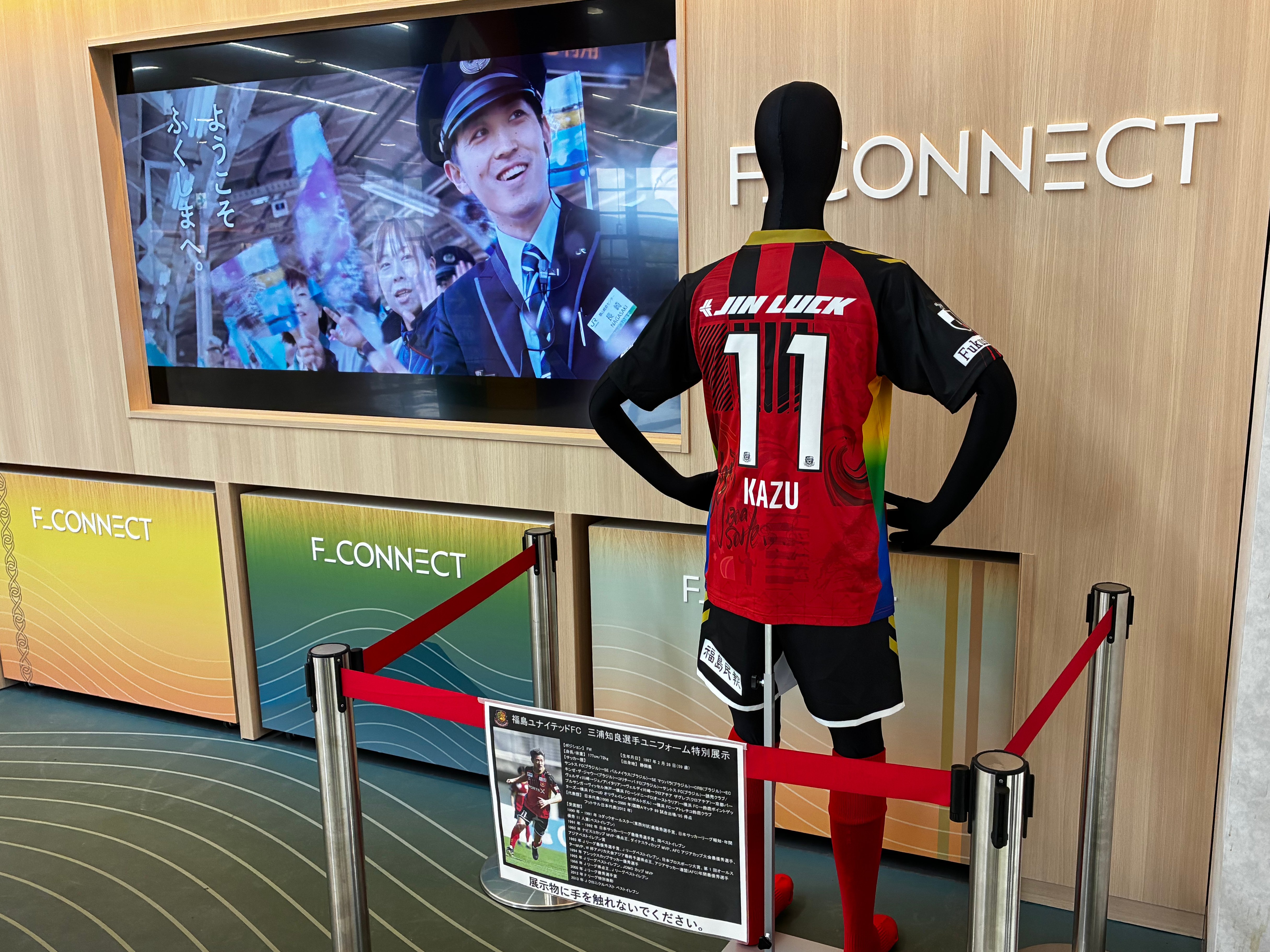 選手等身大パネルは在来線コンコース(新幹線のりかえ口付近)、三浦知良選手のサイン入りユニフォームは新幹線改札内、待合室付近に展示しております。福島駅をご利用の際は、ぜひ足を止めてご覧ください。(展示期間は4月22日(水)~6月30日(火)まで)