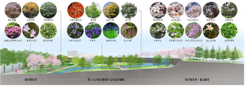植栽計画は、大阪の桜の新名所をつくるほか、モミジやカツラ等の紅葉の美しい樹木や、ハナショウブやツツジ類といった日本で古来から親しまれている花類を配置。年間を通して日本の四季の美しさを感じられる計画とする。また、上町台地や大阪近郊の丘陵地に生育する里山植生(在来種)も取り込むことで、大阪らしさを表現するとともに生態系に配慮する。