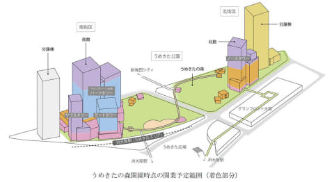 うめきた公園は「サウスパーク」と「ノースパーク」で構成され、サウスパーク全面とノースパークの一部は24年9月の先行まちびらき時に開園した。うめきたの森は「うめきた公園ノースパーク後行工区」の一部で、約9,000m2。うめきたの森開園時点で未完成エリアは約1,400m2となる。