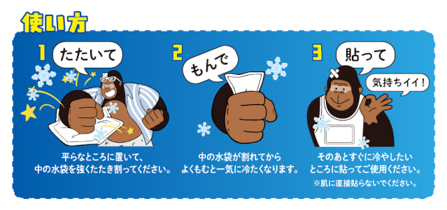 「ゴリラパンチ」は、水と薬剤(尿素・塩化アンモニウム)の化学反応によって、瞬間的に冷たくなる冷却剤。平らなところに置いて、中の水袋を強くたたき割ることで、粒状の内容物が水に溶けて冷却が始まる。