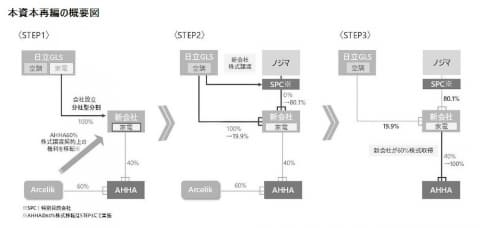 第2ステップでは、家電事業を新会社に移管するとともに、ノジマが資金調達の目的で設立した完全子会社である特別目的会社(SPC)を通じて、新会社の株式の80.1%を取得し、ノジマの連結対象会社とする。日立GLSがノジマに譲渡する株式の価格は約1,100億円としており、最終的な譲渡価格は調整後に決定する。