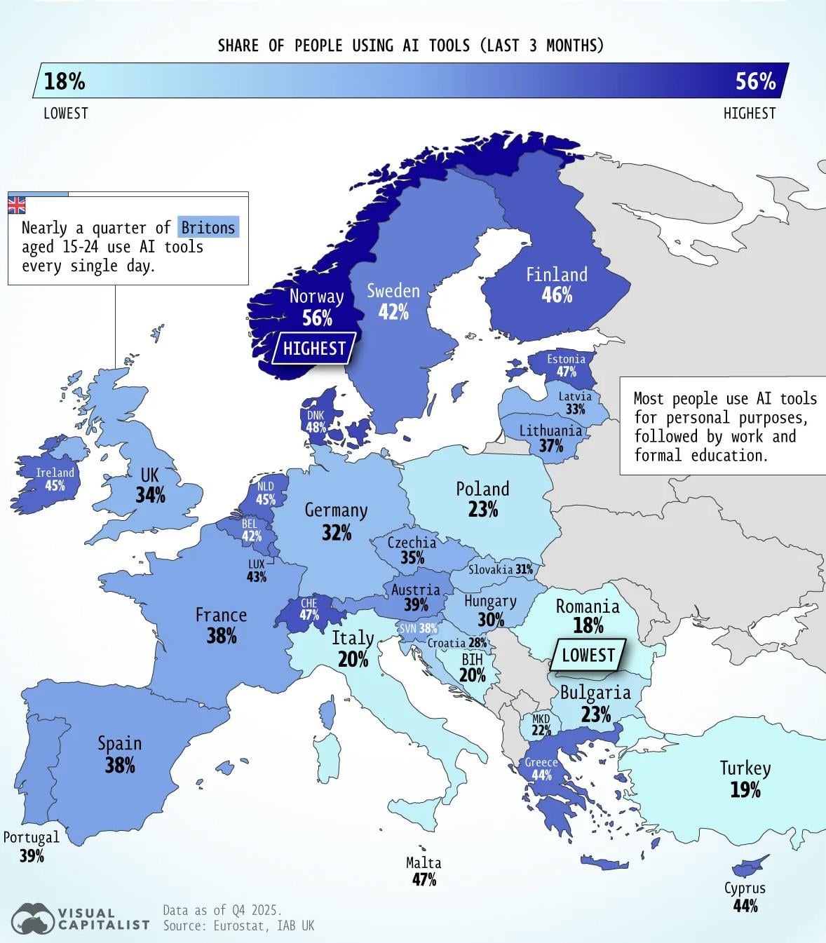 2025 年の欧州レベルでは、16 ~ 74 歳の人口の 32.7% が AI ツールを使用しています。 イタリアではそのシェアは19.9%に相当しますこの国はヨーロッパのランキングで最後から2番目の位置にあり、唯一ルーマニア(17.8%)を上回っています。