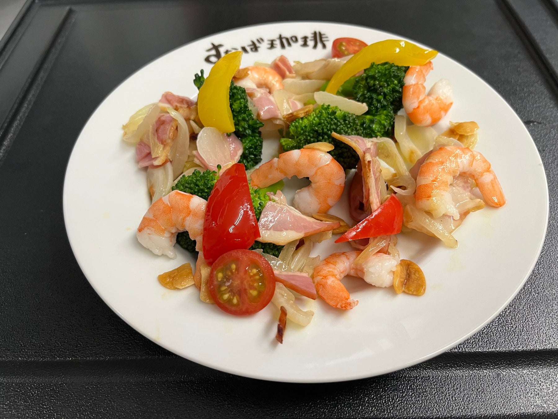 写真9:ぎんりん亭「海老、ベーコン、ブロッコリーのガーリック炒め」