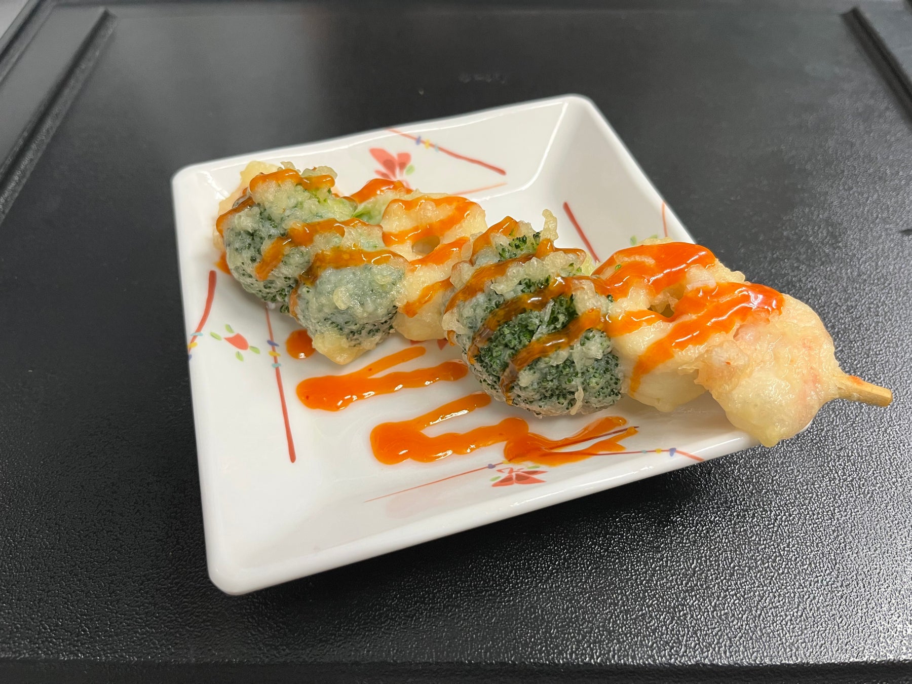 写真7:ぎんりん亭「とうふちくわ、海老、ブロッコリーの串天」