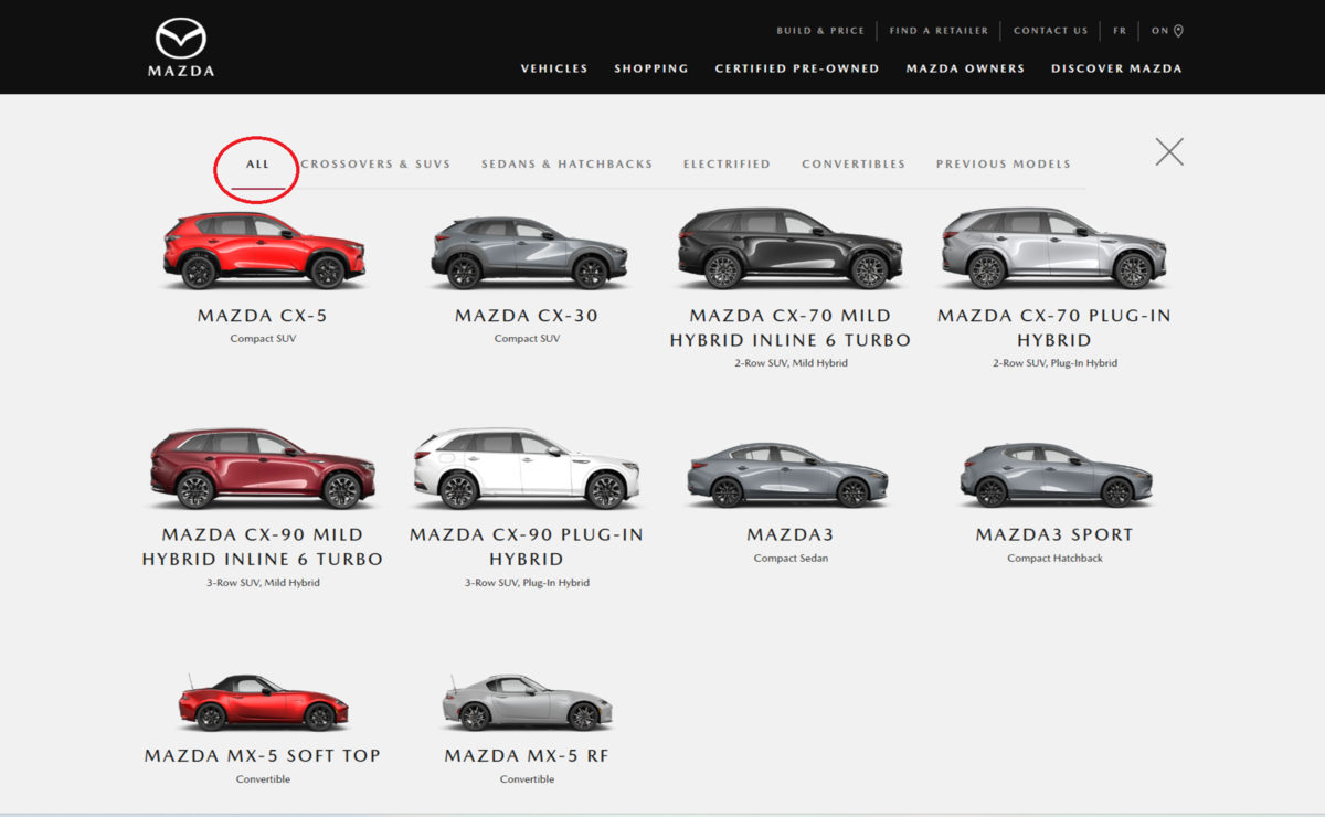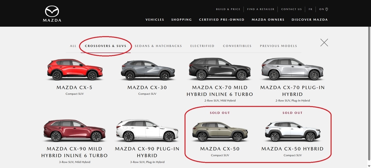 これまでカナダマツダはCX-50を”LIMITED INVENTORY(在庫に限りあり)”と公式HPで案内してましたが、今日チェックすると注釈が”SOLD OUT”に変更されており、全ラインナップ一覧表示(ALL)ではCX-50が無くなってました。
