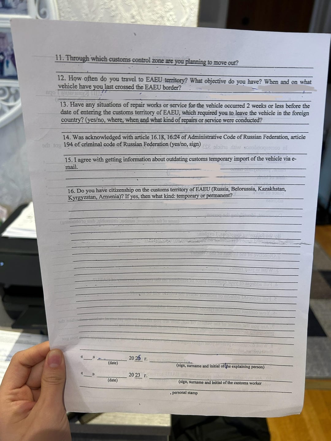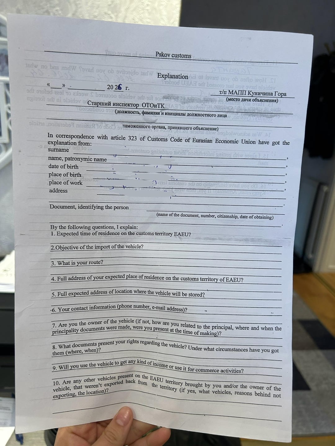 こんにちは! ラトビアのテレホワとロシアのブラチキ国境を車で通過する予定です。国境で税関申告書(プスコフ税関)に記入する必要があると聞き、インターネットでフォームを隅々まで探していたので、何を書いているかは知っていましたが、運がありませんでした。 PDFでどこで見つけられるか知っている人はいますか? それが役立つ場合は、どのようなものになるかを示すサンプルシートがあります。 Latvia