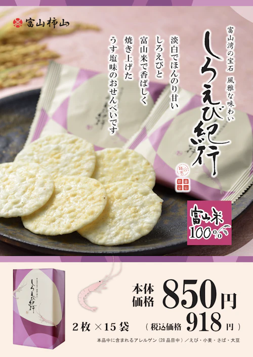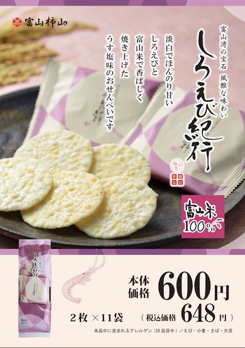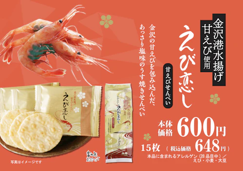 金沢港水揚げの甘えびを使用した香ばしい海老せんべいです。富山県産米を100%使用しており、パリッとした食感とほんのり甘いエビの風味が特徴の米菓です。