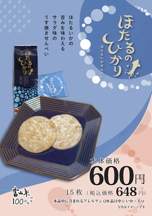 ほたるいかの風味と富山産のお米を100%使用した、富山の味が堪能できる贅沢なおせんべい。