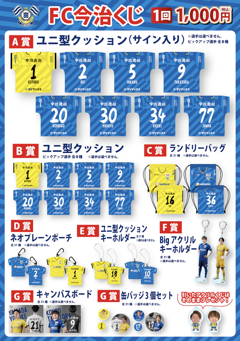 選手のサイン入りユニ型クッションや、BIGアクリルキーホルダーなど多彩なアイテムが当たります!