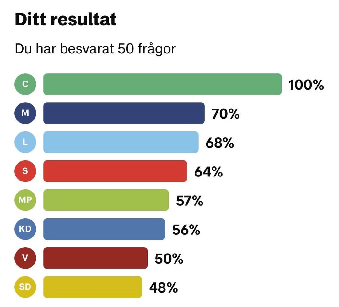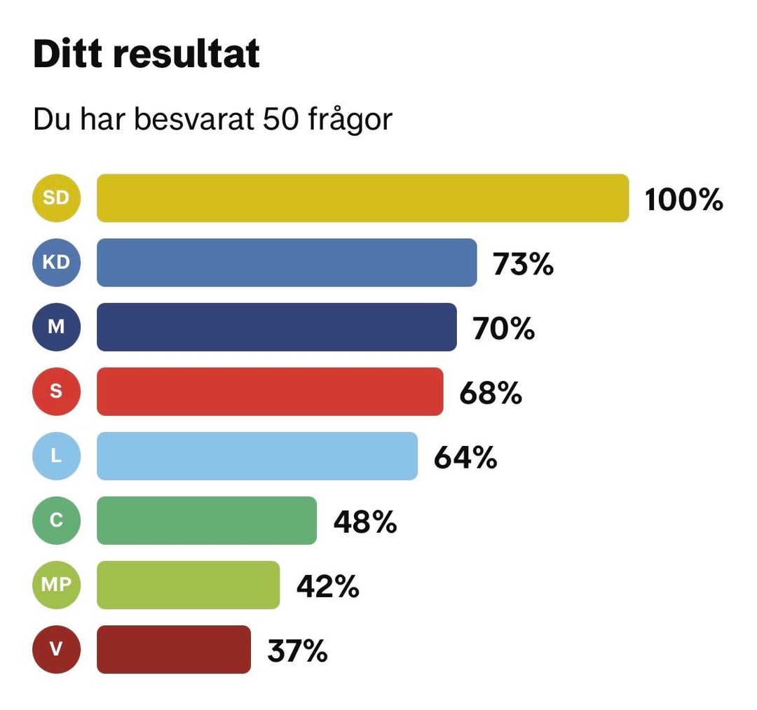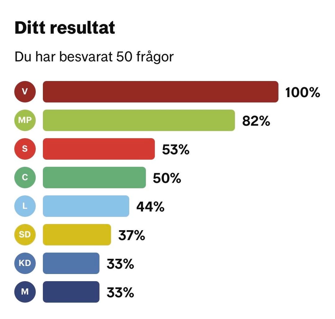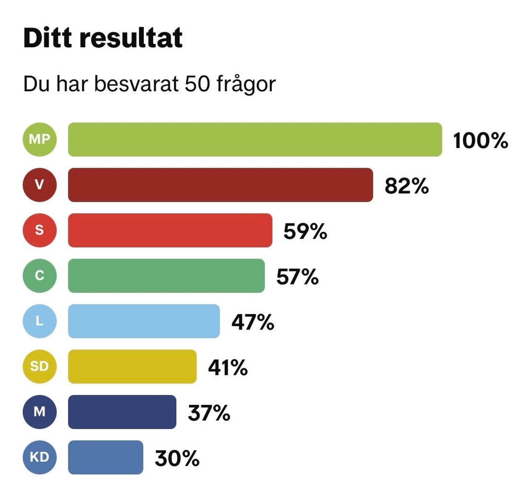 その方法論としては、すべての質問に対する回答を選択した各政党の選挙コンパスを 1 回ずつ記入していきます。次に、他の政党がどの程度当党と同じ回答をしているかを見てみました。これは関係者の回線に入力されます。奇妙なことに、どの政党から回答を選んだかによって、割合が 1 パーセント ポイント異なることがあります。 すべての数字が正しいことを願っていますが、再確認したい場合は、選挙コンパスの結果が図 2-9 に含まれています。 Sweden