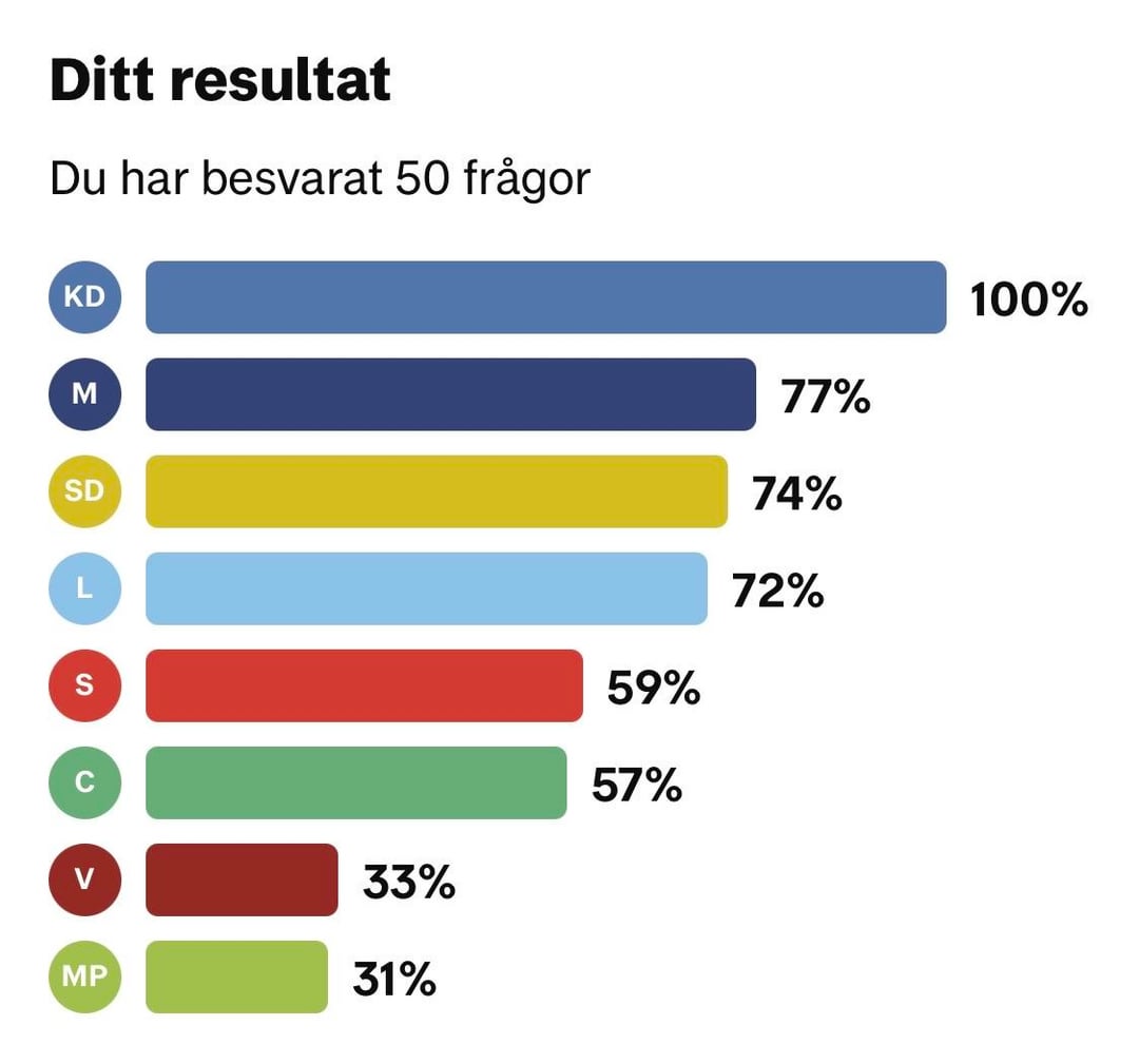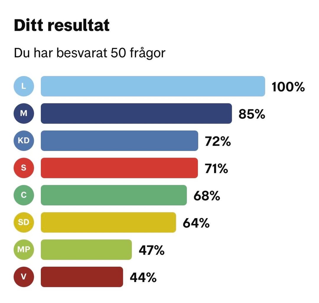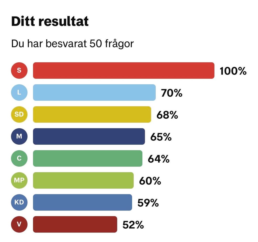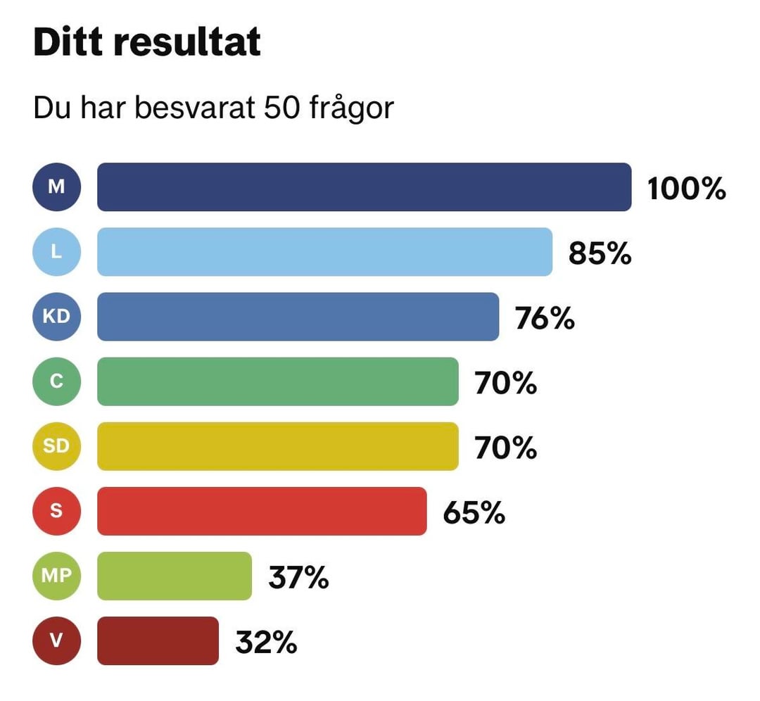 その方法論としては、すべての質問に対する回答を選択した各政党の選挙コンパスを 1 回ずつ記入していきます。次に、他の政党がどの程度当党と同じ回答をしているかを見てみました。これは関係者の回線に入力されます。奇妙なことに、どの政党から回答を選んだかによって、割合が 1 パーセント ポイント異なることがあります。 すべての数字が正しいことを願っていますが、再確認したい場合は、選挙コンパスの結果が図 2-9 に含まれています。 Sweden