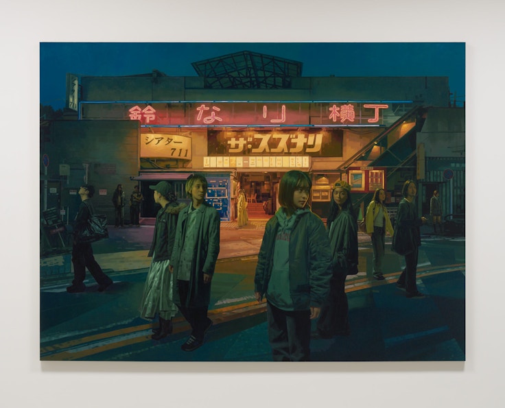 先に挙げた《Night Shift》のように人の気配がない空間が描かれることもあるが、森本の作品に登場する人物も印象的だ。《Stories we told ourselves》(2026)では「鈴なり横丁」と書かれた繁華街のネオンの光に照らされた複数の人物が様々な方向に視線を向けている。森本の作品は、街中で撮影した風景と、知人を被写体にした写真から切り出した人物を組み合わせたコラージュで構成されている。登場する場所も人物も特定されず匿名であるため、鑑賞者はそのなかに自らの想像力を働かせ、作品の登場する人物の視線の先の物語を想像する。