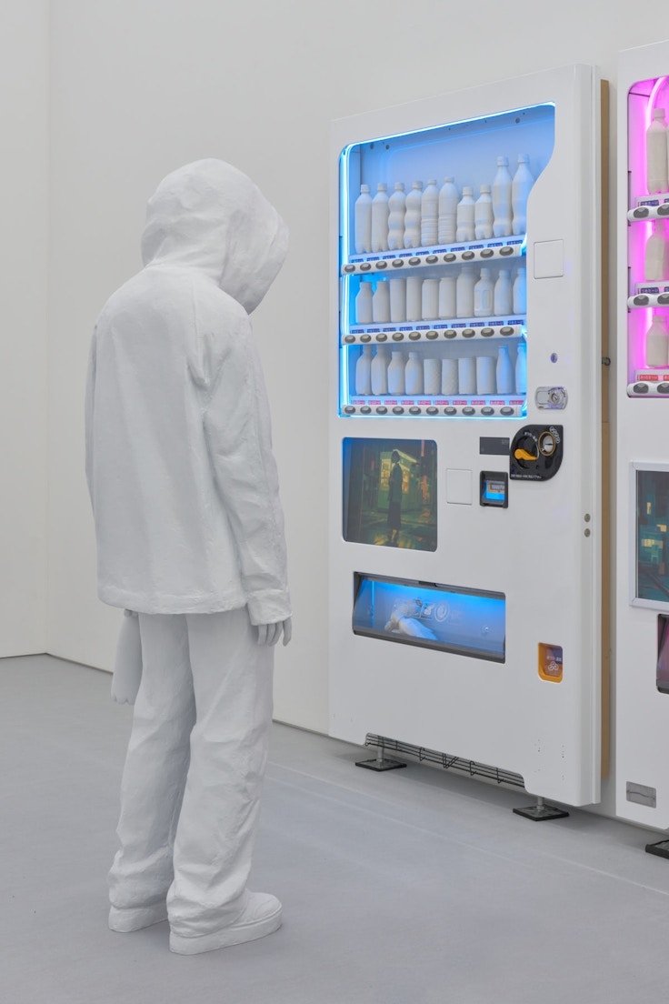 今回の個展では、初のインスタレーション作品も展示された。《Encounter》(2026)は、これまで平面作品で描かれてきた人物を立体化した造形と、自動販売機のモチーフを組み合わせた新作である。絵画で表現されてきた都市の空間が、鑑賞者自身が体感できる立体的な場として拡張され、光や空気感、時間の流れまでをも体験させる構成になっている。