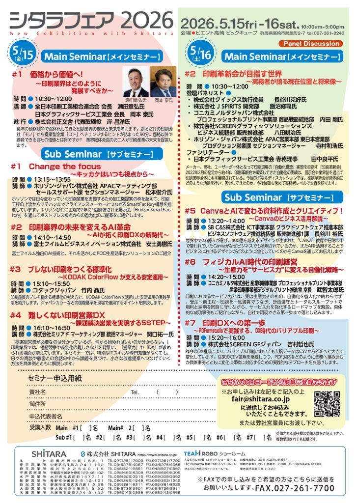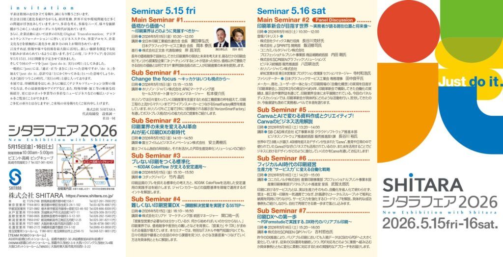 シタラフェア2026は5月15日・16日の2日間にわたり開催される。テーマは「Just《just do it;実行の時》」。急速に変化する経済環境や人材構造の変化、環境対応、デジタル化の加速など、企業を取り巻く課題が複雑化するなか、“とにかくやってみる”という行動の重要性を掲げ、印刷業界の未来を切り拓く最新技術と実践的ソリューションが一堂に会する。