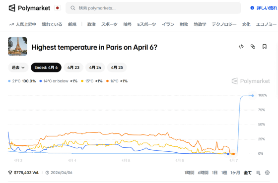 Polymarketでは気象現象に関する賭けも行われており、その中には「Highest temperature in Paris on April 6?(4月6日のパリの最高気温は?)」というものもありました。この賭けでは大半のユーザーが14℃~16℃を予想していましたが、大穴である「21℃」に賭けた1人のユーザーがおよそ1万4000ドル(約223万円)もの大金をゲットしました。このユーザーはわずか数日前にアカウントを開設したばかりだったとのこと。
