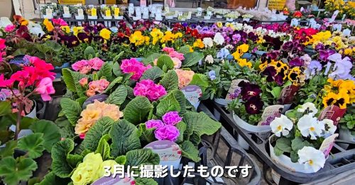 撮影時は3月ということもあり、入口付近には、春を感じさせる色とりどりの花の苗がずらりと並んでいました。