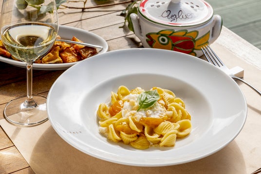 イエローダッテリーノのソースであえたオレッキエッテにストラッチャテッラ(砕いたモッツァレラと生クリーム)をトッピング。最後に砕いたタラッリを振りかけた南イタリアらしい一皿。