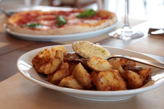 蒸したジャガイモをちぎって香ばしく揚げ、特製のアンチョヴィ入り地中海風ソースで食べるイータリーオリジナルのポテトフライ。イタリア館のレストランでご注文数トップ3に入る人気のメニュー。