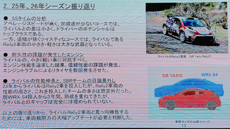 BRZをベースとしたのは軽量化を優先しているためで、これにより軽量化と前輪荷重の軽減を実現しているという。前輪と後輪の重量配分も4WDとして理想的なものになっているとし、全日本ラリーに参戦しているラリー2と真っ向勝負できるものであると紹介された。