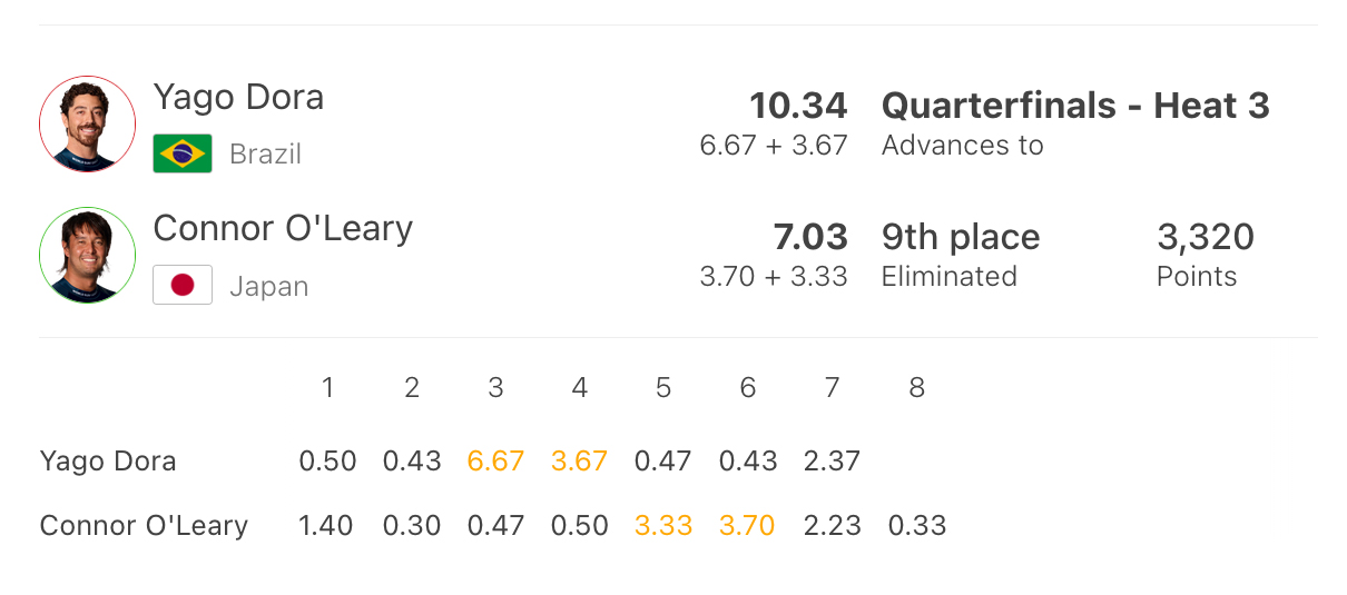 サイズのあるラストウェイブを掴んだカノアは、エアドロップ気味にリエントリーを決め、エンドセクションもメイク。スコアは7.13と僅かに届かず。カノアはここで惜しくも敗退。今大会は9位でフィニッシュ。次回のスナッパーでの更なる活躍に期待がかかる。