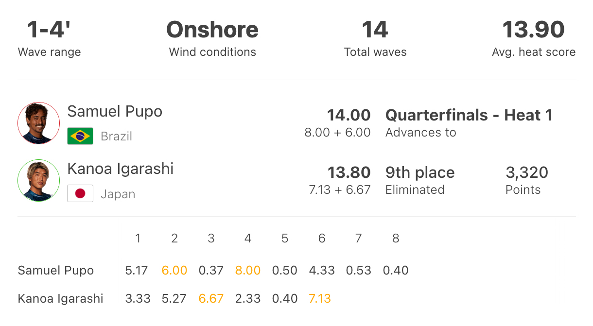 プポは優先権を使いセットの波を捉えるとパワーカーブで8.00のエクセレントをスコア。再びトップを奪い取る。後半に入り、優先権を持ってスコアリング・ウェイブを待つカノアはニード7.34と追い込まれた。
