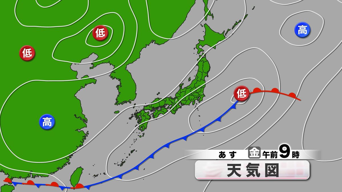 きょう23日(木)の雨の原因となった低気圧や前線は、これからあす24日(金)にかけて日本の東へ遠ざかる予想です。代わりに大陸からは高気圧が張り出し、県内の天気は順調に回復へ向かっていきます。