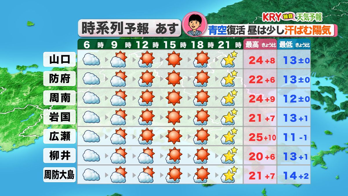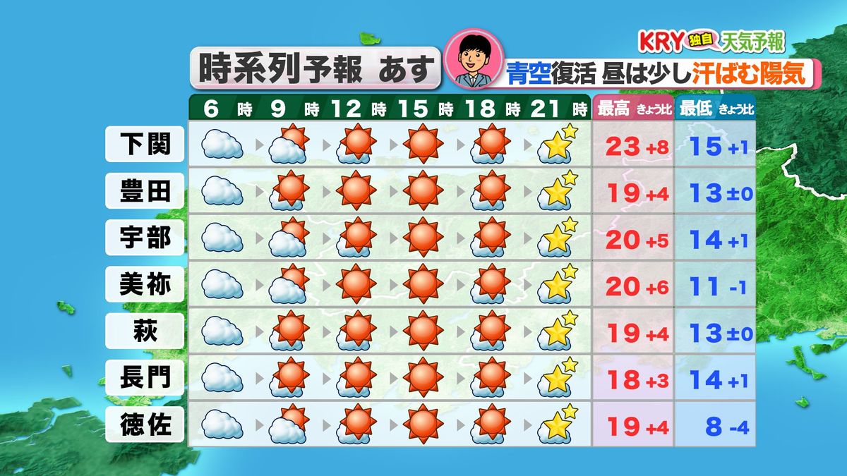 あす24日(金)は青空が復活。最高気温も20度を超えるところが多く、ところどころで汗ばむ陽気となりそうです。