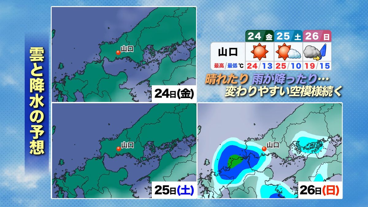 あさって25日(土)も引き続き気温が高く、安定した空模様ですが、26日(日)は九州・四国方面から雨雲が接近し、午後はにわか雨の心配があります。