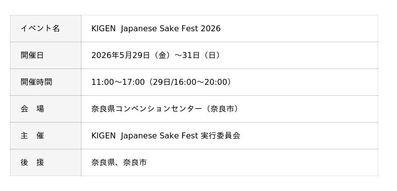 清酒発祥の地・奈良にて、全国の酒蔵が一堂に会する日本酒フェスティバル「KIGEN Japanese Sake Fest 2026」を、2026年5月29日(金)~31日(日)の3日間、奈良県コンベンションセンターにて開催します。「起源から、世界へ。」をコンセプトに、日本酒の歴史・文化を体験型で伝える新しい日本酒の祭典です。奈良という歴史的背景を舞台とする“起源”から、日本全国の蔵元とともに、世界へと繋がる日本酒の魅力を発信します。