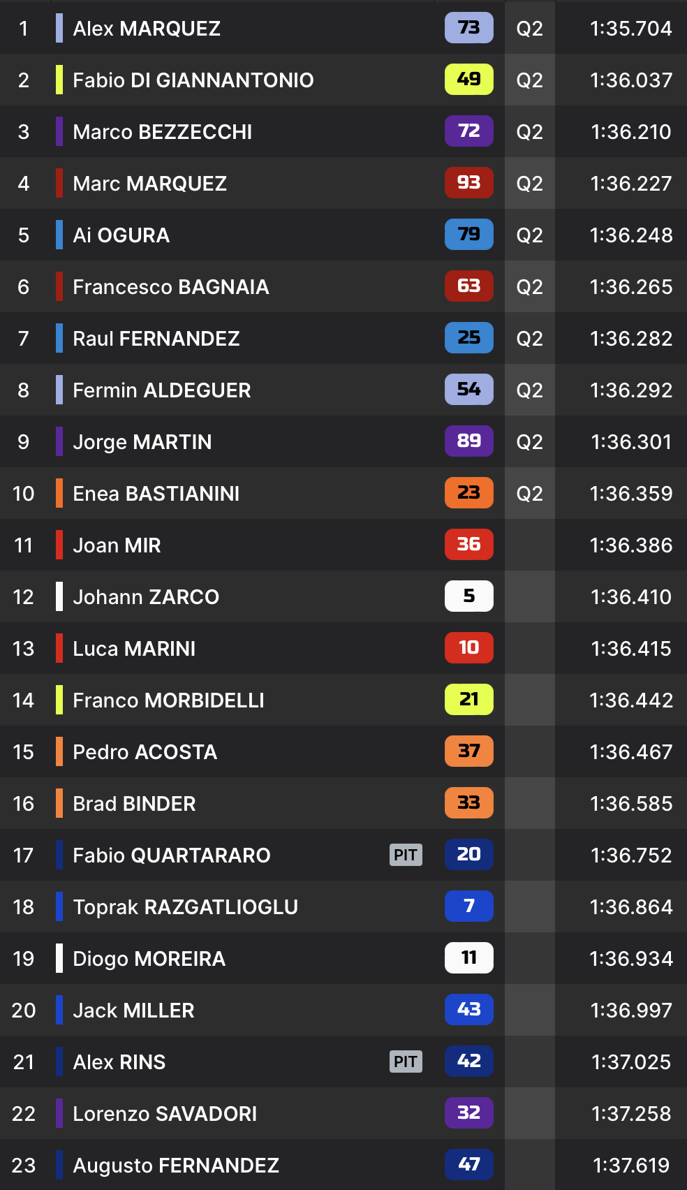 午前中に最速タイムを記録したファビオ・ディ・ジャンナントニオは彼の後ろでフィニッシュし、マルコ・ベッツェッキはスペインで苦戦したアプリリアでトップ3に入った。一日の初めから苦戦し、怪我にも悩まされていたマルク・マルケスは、兄より5秒遅いものの、4位でフィニッシュした。それでも彼はQ2への出場権を確保した。