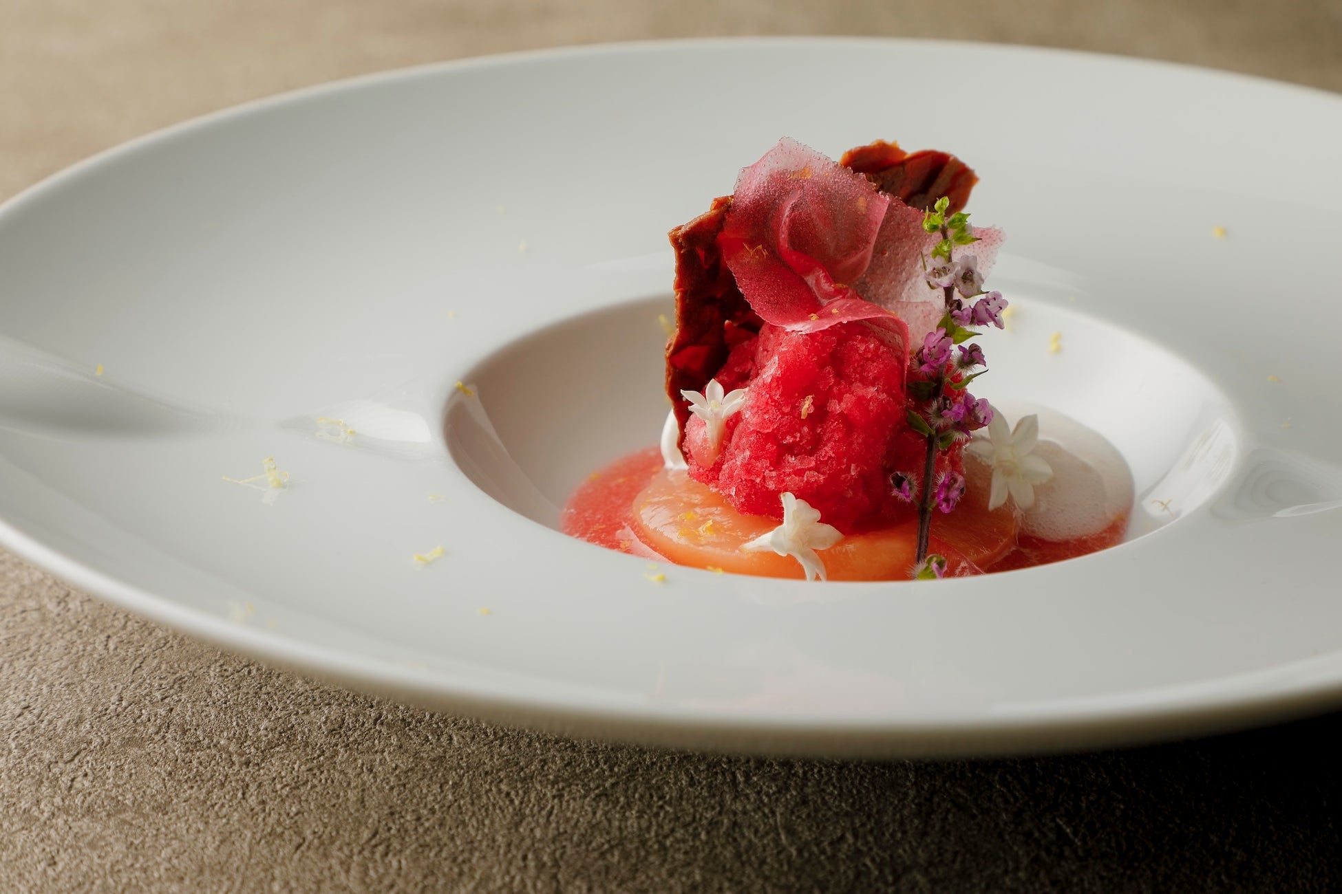 「TENJIN」オールデイダイニングでは、「サマーアフタヌーンティー -青嶺(あおね)-」が登場します。白桃のムース「白桃 グロゼイユ」や、サブレとムースで夏のアイコンに見立てた「麦藁ぼうし〜パッションマンゴー〜」、フレッシュな「パイナップル タルト」や、爽やかな甘酸っぱさが心地良く広がる「ババ ピーチメルバ」など、やさしい甘さの白桃とジューシーなトロピカルフルーツの見た目や香り、味わいなどの多彩な表現をご堪能いただけます。また、ランチやディナーでは、ジロール茸やアーティチョークの芳醇な香りを楽しむメイン「仔羊 アーティチョーク チョリソー」や、ベルガモットシロップでマリネした国産桃1/2個を贅沢に使ったデザート「白桃 赤紫蘇 ベルガモット」など、夏の食材が主役のこの時期ならではの旬なメニューをご用意しています。