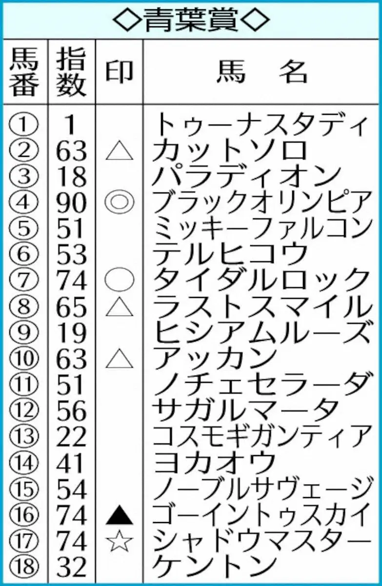 2枚のダービー切符を懸けた青葉賞。AIは断トツの指数90でブラックオリンピアを◎に指名した。デビュー3戦目、フルゲート18頭だった芝2200メートルの未勝利戦を快勝。続くアザレア賞は1F延長、9頭立てのスローペースを全く問題にせず連勝した。性質の異なるレースを、いずれも好位抜け出しの正攻法でクリアし高い素質をアピール。東京コースもデビュー戦(鼻差2着)で経験済みで、力を出し切れる条件とジャッジした。