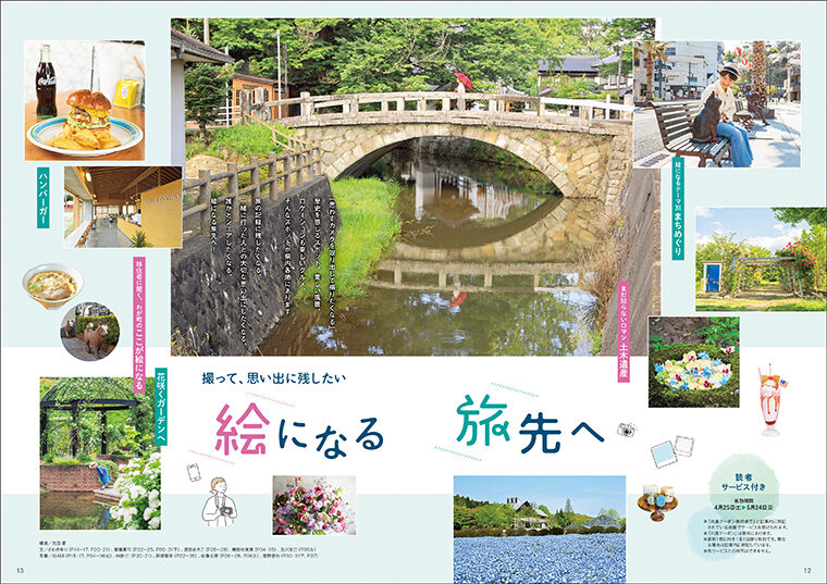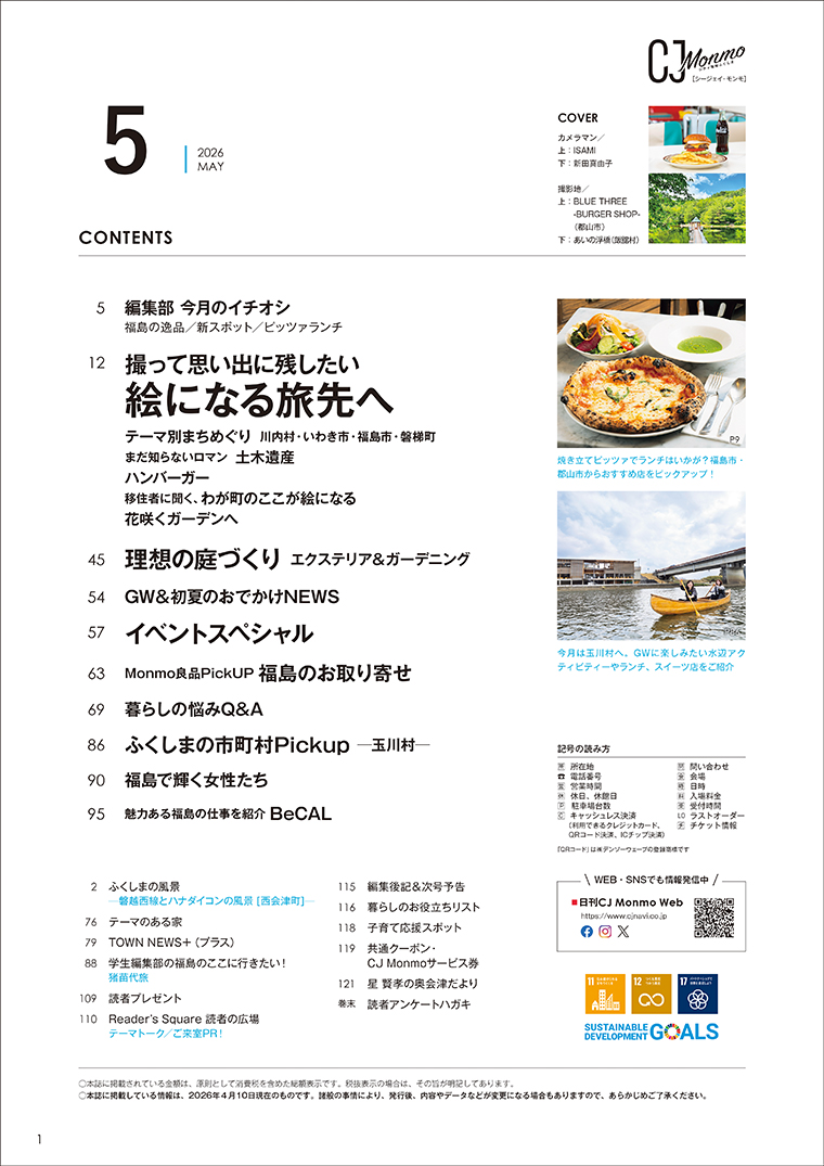 福島県のタウン情報誌「CJ Monmo」5月号は、ゴールデンウィークや新緑シーズンに出かけたい“写真を撮りたくなるおでかけ先”を特集。