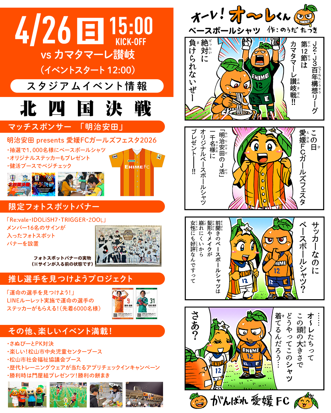 明日、4月26日(日)は、愛媛FCホームゲーム vs カマタマーレ讃岐 15:00キックオフ!