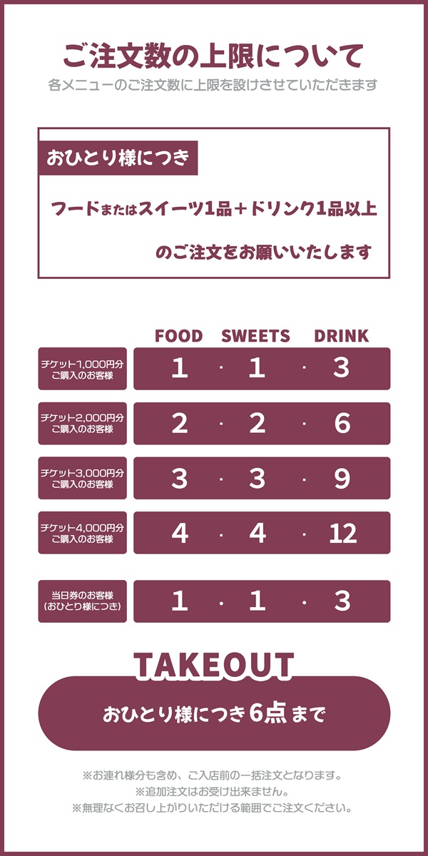 グッズの購入上限数につきましてはカフェのご予約席数ではなく、実際にご来店いただいたご利用人数が基準となります。1名で2名席(2,000円分)のチケットをご予約・ご利用いただいた場合でも、お買い求めいただけるのはおひとり様分の上限数までとなりますので、あらかじめご了承ください。