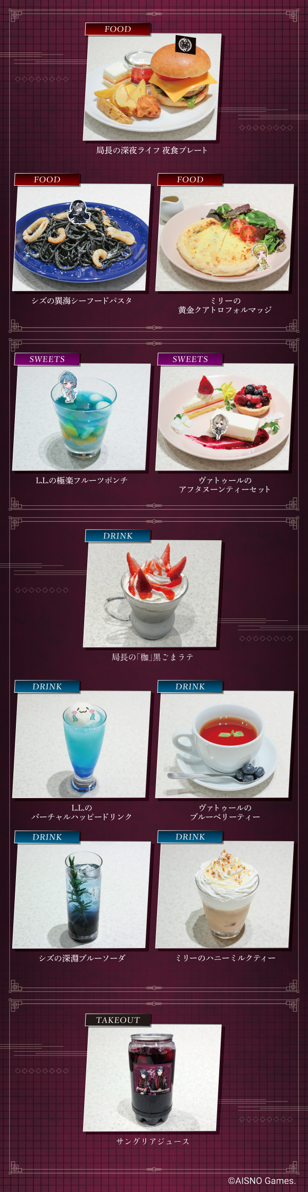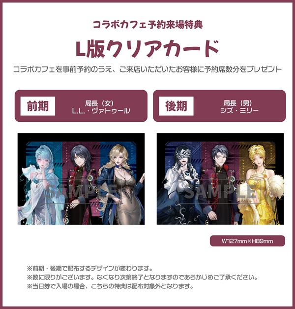 局長やシズ・L.L.・ヴァトゥール・ミリーらコンビクトをイメージしたスペシャルコラボメニューやカフェ限定特典、カフェオリジナルグッズなど充実したコラボ空間をお届けいたします。ぜひ心ゆくまでお楽しみください!