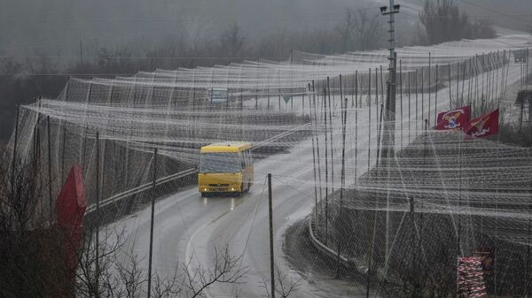ハルキウ州イズム近郊で、ロシアによるドローン攻撃への対策としてネットで覆われた道路=2025年12月撮影(写真:ロイター/アフロ)