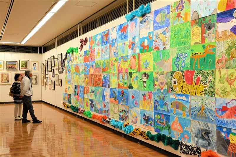 中川絵画教室(熊本市)の生徒ら約80人が水彩、油彩、木版画など約200点を出品。恐竜やアンティークの置物といった題材などを自由に表現したカラフルな作品がそろう。講師の中川恵二さん(高森町)と娘の百合恵さん(熊本市)も賛助出品。