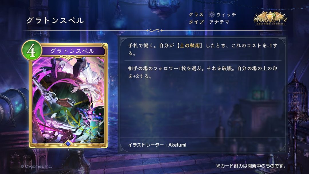 「神殺し・アナテマ / Anathema’s Gambit」の新カード「グラトンスペル」は、ウィッチクラス/ゴールドレアのスペルだ。能力としては、まず相手の場のフォロワー1枚を選んで破壊する。元のコストは4。手札にある間に【土の秘術】が発動すると、コストが1下がる効果をもち、さらに本カードの使用時には【土の印】を+2する。【土の秘術】に関連したコスト低減効果をもつ、ウィッチクラスの新しい除去スペルとなるわけだ。なおCVは、「暴食のアナテマ・ララアンセム」の声も務める岡咲美保さんが担当。本カードも「暴食のアナテマ・ララアンセム」同様、タイプ「アナテマ」のカードとなっている。正確なカードテキストについては下記を確認してほしい。