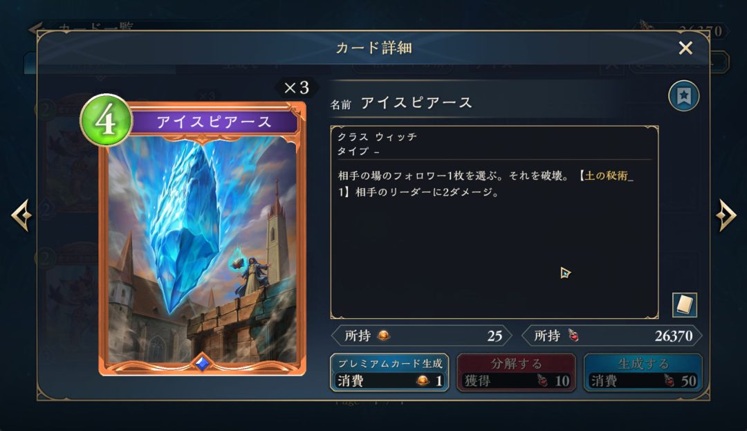 比較対象としては、同じくウィッチクラスの4コストのスペル「アイスピアース」が挙げられるだろう。両カードは、相手の場のフォロワーを選択して破壊する効果をもっており、いわゆる確定除去である点は同じだ。アイスピアースが【土の秘術_1】で相手のリーダーに2点のダメージを飛ばすのに対して、「グラトンスペル」は【土の印】を2増やし、コスト低減効果ももつ。少しでもダメージが欲しいデッキにおいては、「アイスピアース」の方が有用かもしれない。一方「グラトンスペル」は、「秘術ウィッチ」においてはコストが自然と下がっていく上に、デッキ運用上重要な【土の印】の供給能力まで持っている。「グラトンスペル」のほうが、より汎用性が高く強力なカードと言えそうだ。