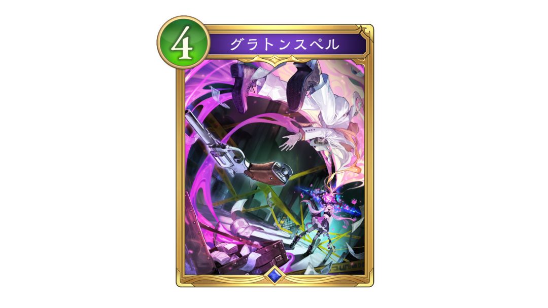 「グラトンスペル」は、いわゆる「秘術ウィッチ」向けの確定除去スペルと言えるだろう。基本的な効果としてはコスト4を支払い、相手の場のフォロワーから1枚を選択し、選んだフォロワーを破壊する。本作の4コスト帯には、ロイヤルクラスの「剣士の斬撃」、ネメシスクラスの「ストリングアサルト」、ウィッチクラスの「アイスピアース」など、相手のフォロワーを選択して破壊する確定除去スペルがいくつも登場している。そうしたカード群同様、【土の印】を増やす効果をもった4コストの確定除去スペルとしても使用できる。