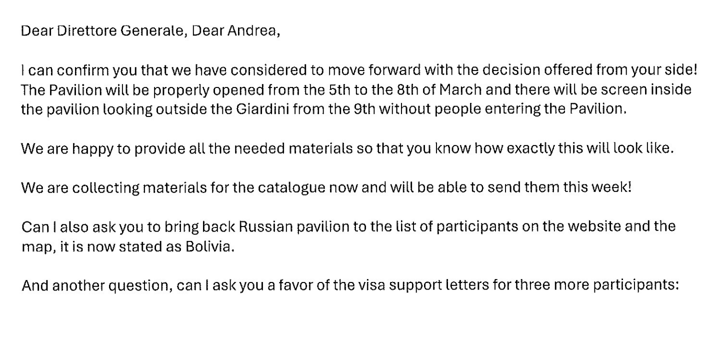 電子メールで行われた会話から、すでに2026年1月には参加が獲得されたとみなされていたことが判明した。ビエンナーレ会長への電子メールでは、 ピエトランジェロ・ブタフオコ、アナスタシア・カルネーワは、ロシア連邦が「第61回国際美術展に参加する」と書いている。 パビリオンプロジェクトも付属