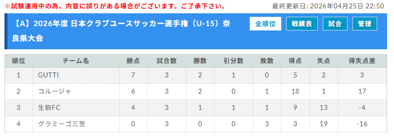 A 4/25全試合終了 GUTTI、コルージャが2次リーグ進出