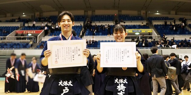 剣道の第74回関西学生選手権大会・第57回関西女子学生選手権大会が4月26日、大阪市のおおきにアリーナ舞洲で開催され、大阪体育大学は、男子の戸田翔海(かける、スポーツ科学部3年、埼玉・本庄第一高校)、女子の橋本凛音(りの、スポーツ科学部2年、兵庫・甲子園学院高校)がともに8強に入り、優秀選手賞を獲得した。