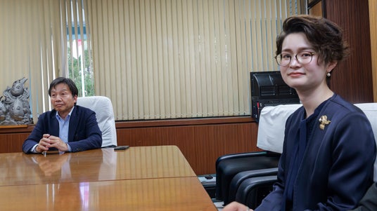 株式会社ミセカタ代表取締役の諸藤圭代と熊本市北区区長が動画を視聴している様子