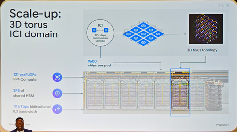 今回その帯域幅が2倍の2.45TB/sに強化されており、スケールアップ時の性能が引き上げられた。さらに従来のIronwoodでは1ポッドあたり最大9,216基だったものが、今回のTPU 8tでは9,600基までスケールアップできるようになっている。