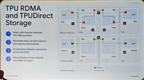 また、HBMメモリ同士のDMA転送となるRoCE V2のRDMAに加えて、ストレージへのRDMAとなる「TPUDirect Storage」にも対応し、ストレージからメモリへのデータの読み込みが高速化されている。