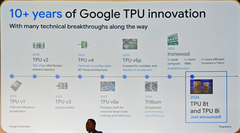 Alphabet傘下のGoogle Cloudは、4月22日から4月24日にかけて米ラスベガスにて開催中の年次イベント「Google Cloud Next ’26」において、AI演算向けのTPU(Tensor Processing Unit)の第8世代製品となる「TPU 8t」、「TPU 8i」の2製品を発表した。
