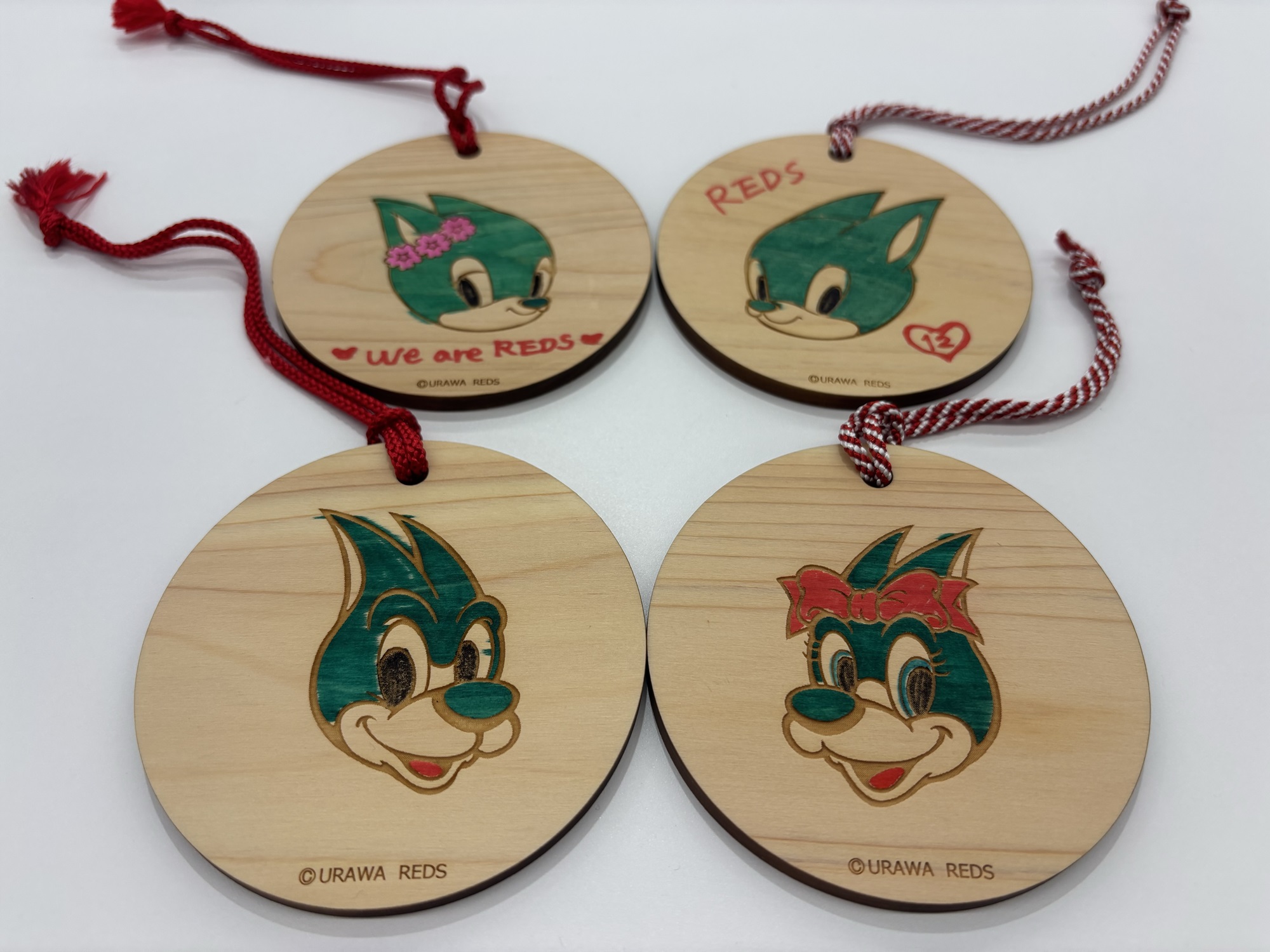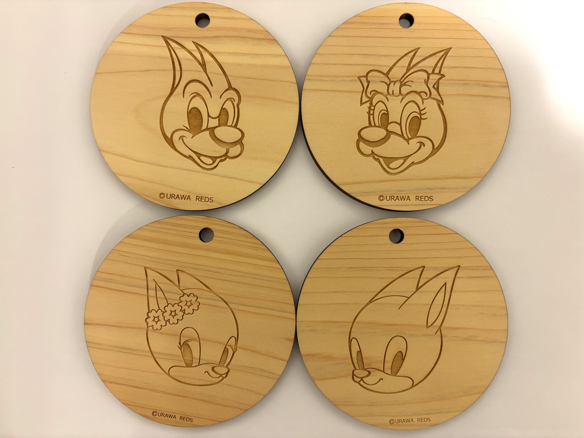 浦和レッズのマスコットである「レディア」「フレンディア」「シャーレくん」「ディアラちゃん」がそれぞれデザインされた直径9cm程度の県産ヒノキ材(間伐材)に色付けや絵付けをして、自分だけのオリジナルキーホルダーを作るワークショップです。