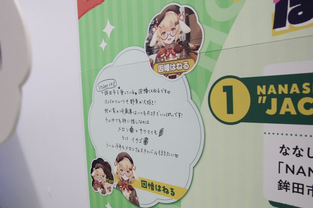 「超サブカル茨城」ブースの中には、「ななしのホコタ開拓期」に参加している因幡はねるさん、宗谷いちかさん、堰代ミコさん、柚原いづみさん、月野木ちろるさんのパネルが展示。5人からの直筆メッセージと、ななしいんく&鉾田市のコラボの歴史が分かるパネルも飾られていた。